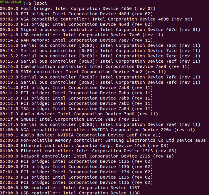 [Ubuntu 20.04] lspci 명령시 하드웨어 모델명 보이게 하는 법 Ubuntu에서 아래와 같은 코드 입력 시 $ lspci 이와 같이 제조사만 나오고 Device 번호만 나오는 경우가 있다. (VGA, Ethernet 등) 이럴 때 아래의 코드를 입력하면 쉽게 고칠 수 있다. $ sudo update-pciids 결과! (안 바뀐 부분도 있지만 우리가 주로 검색하는 VGA, Ethernet, Network 등은 바뀐 것을 확인할 수 있다.) 쓸모있는 잡지식/우분투 2022.12.09